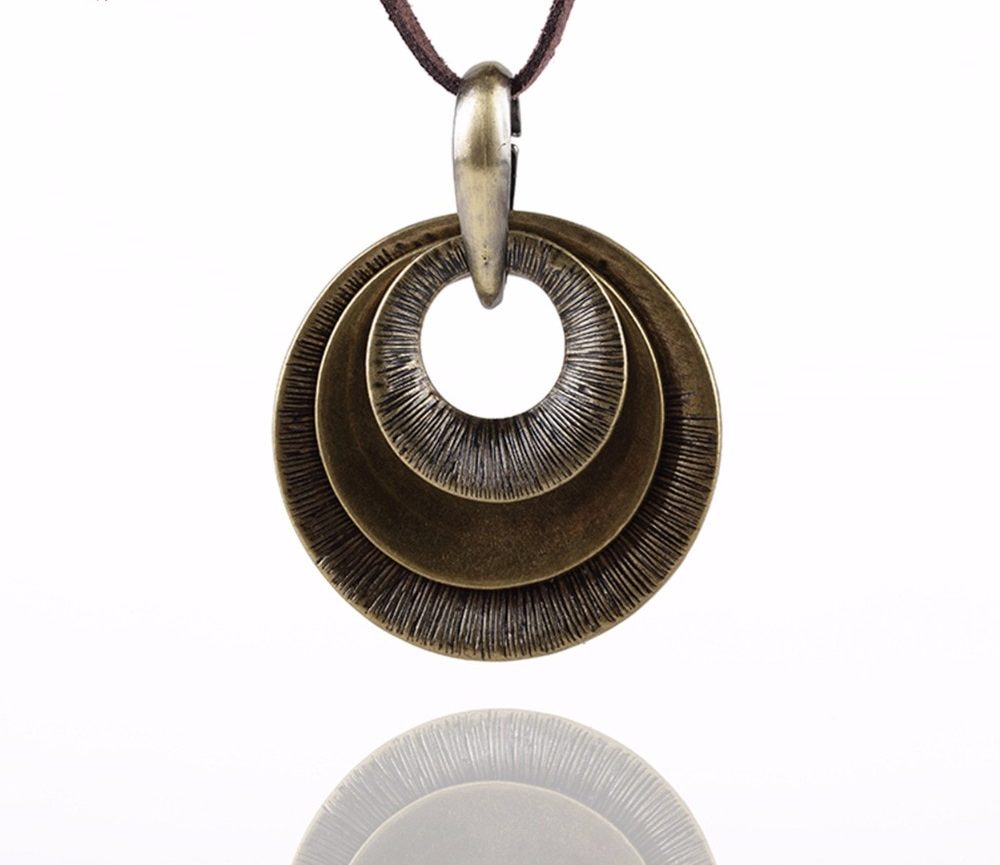 Colier statement Spinning Circles cu detalii metalice concentrice si snur lung de 45 cm din piele